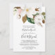 Este elegante convite para Bat Mitzvah, branco de magnólia, é perfeito para um morcego moderno. O design floral suave apresenta coloração aquosa, cor-de-rosa pincelada, impressionantes flores brancas de magnólia e algodão, com ouro e folhas verdes, num arranjo luxuoso.