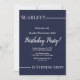Este elegante convite de aniversário azul e branco é perfeito para um aniversário moderno. o simples design apresenta uma caligrafia branca elegante num fundo azul marinho.