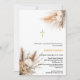 Este chic boho pampas gramínea cruzou o primeiro convite da comunhão sagrada é ideal para um batismo contemporâneo para bebês. O design simples incorpora ouro minimalista tradicional e fonte branca com uma vibração boêmica rústica. Qualquer cor é possível. Mantenha o design simples e elegante como está, ou personalize-o com seus próprios designs e trabalhos de arte.
