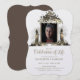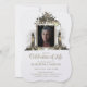 convite de celebração da vida com foto emoldurada com velas douradas e foto no meio com tipografia elegante em fundo Creme Branco na frente e dourado escuro no verso.