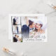 Elegante fuga romântica ou convite de anúncio de casamento privado e recepção com a foto do dia do seu casamento sobreposta com uma faixa de três fotos quadradas menores e "Celebre Conosco" em uma fonte moderna. Adicione seus primeiros nomes, data e local do casamento em tipografia simples. No verso, personalize seu anúncio de casamento e convite de recepção e adicione seus nomes em uma fonte semelhante a uma assinatura.
