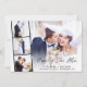 Elegante anúncio de casamento ou convite de recepção e elopamento privado com a foto do seu dia de casamento sobreposta com uma faixa de três fotos quadradas menores e "Feliz para Sempre" em um script moderno e elegante. Adicione seus primeiros nomes, data e local de casamento em tipografia simples. No verso, personalize seu anúncio de casamento e convite de recepção e adicione seus nomes em um script semelhante a uma assinatura.