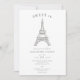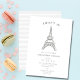 Um convite de festas elegante, na moda e minimalista Sweet 16 com um tema Paris, com uma torre Eiffel coberta de rochas (este é um efeito digital), uma simples tipografia e listras delicadas e desenhadas à mão no verso.