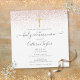 Com elegante brilho rosa dourado e um simples crucifixo dourado, este primeiro convite de comunhão sagrado chic pode ser personalizado com suas informações especiais de evento. Projetado por Thisnotme©