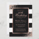 Convite de festas rosa aniversário de 40 anos preto e ouro moderno com detalhes da parte dentro a um quadro ouro rosa contra um fundo listrado preto e branco adornado com confete rosa gold. Personalize facilmente esta modelo a qualquer festa de aniversário.