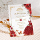 O convite perfeito para a quinceañera da sua filha está finalmente aqui! Este convite cômico e adorável da quinceañera apresenta elegantes rosas vermelhas de aquarela, um vestido de princesa bonito, uma tiara com brilho dourado e duas borboletas fluidificantes. Clique no botão "personalizar mais" se quiser reorganizar e formatar o estilo e a posição do texto.