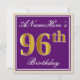 Este design de convite simples e bolsa mensageifesta de aniversario elegante apresenta uma mensagem personalizada como "ANameHere's 96th Birthday" (com o "96º" a ter uma aparência falsa/imitada de cor dourada) dentro de uma área quadrada de cor roxa com um contorno simples de fronteira. O nome está em um texto elegante, de cor branca, semelhante a script, e pode ser personalizado. A parte traseira apresenta detalhes de convite personalizáveis. Um convite de aniversário como este poderia talvez ser usado ao convidar pessoas para uma festa de aniversário que está sendo realizada para alguém que está comemorando seu 96º aniversário. [~Z0000226]