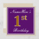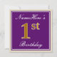 Este design de convite simples e bolsa mensageifesta de aniversario elegante apresenta uma mensagem personalizada, como "primeiro aniversario do NomeAqui" (com as "1ruas" com aparência falsa/imitação de cor dourada), dentro de uma área quadrada de cor roxa com um contorno simples de borda. O nome está em um texto elegante, de cor branca, semelhante a script, e pode ser personalizado. A parte traseira apresenta detalhes de convite personalizáveis. Um convite de aniversário como este poderia talvez ser usado ao convidar pessoas para uma festa de aniversário em prisão preventiva para alguém que comemora seu primeiro aniversário. [~Z0000226]