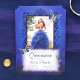 Esta elegante borboleta azul Quinceanera convite com decoração, quadro fotográfico antigo é versátil para temas azuis-escuros, azuis-marinho ou azuis-reais. As borboletas podem ser movidas e redimensionadas. Um belo escrevendo de escrituras é atraente com o seu retrato do vestido de azul ou cerulano. O convite popular para Quinceanera azul e ouro é ideal para cartões digitais, arquivo digital para compartilhar convites para texto.
