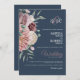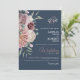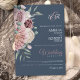 Um belo convite para o casamento com flores impermeáveis pintadas à mão em tons rosa quente e marfim com um toque de verde eucalipto em um fundo azul real. No verso encontrará um pequeno arranjo de flores. Você pode adicionar suas informações pessoais indo para o menu personalizar. Isto é parte de uma elegante suíte de casamento com correspondência, cardápio, cartões de lugar e outros bens essenciais.