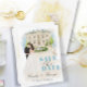 Anuncie seu dia especial com nosso Elegante Salve o cartão de Data. Apresentando uma ilustração romântica da Noiva e do Cavalo em um local pitoresco com uma charmosa fonte adornada de flores e duas pombas graciosas, esta design dá o tom perfeito para o seu casamento. O verso mostra um fundo de ouro luxuoso com pombas adicionais, simbolizando amor e unidade. Personalize com seus nomes e data de casamento para torná-lo exclusivamente seu. Perfeito para casais que buscam uma maneira sofisticada e memorável de compartilhar suas grandes notícias
