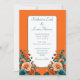 Este é um elegante convite de casamento floral com azul lacrimejante e flores laranja queimadas em um design de fundo cor de laranja e branco. É perfeito para uma celebração romântica de casamento no outono.