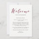 Esta elegante carta de boas-vindas ao casamento, para inserir nas suas bolsas de boas-vindas ao convidado de casamento, mostra a caligrafia de cor marsala / burgundy junto com o texto preto moderno sobre um fundo branco limpo.