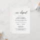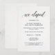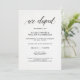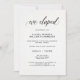 Essos convites de recepção "nós fugimos" elegantes apresentam um fundo branco com aparência de papel aquarela e caligrafia preta elegante para um visual moderno minimalista.