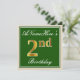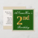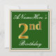 Este convite de aniversário de design simples e elegante apresenta uma mensagem personalizada como "Aniversário de 2 anos do ANameHere" (com o "2º" tendo uma aparência dourada falsa/imitação) dentro de uma área quadrada de cor verde com um contorno simples de borda. O nome está em uma fonte elegante de cor branca com aparência de texto manuscrito, e pode ser personalizado. O verso apresenta detalhes personalizáveis do convite. Um convite de festa de aniversário como este poderia ser usado ao convidar pessoas para uma festa de aniversário realizada para alguém que está celebrando seu segundo aniversário. [~Z0000225]