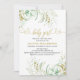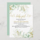 Chá de fraldas de menina com elegante verde e caligrafia. O design apresenta uma delicada folhagem de aquarela com folhas de ouro e plasmas de tinta. A Menina é manchada com espirais e corações de amor. O modelo está configurado para você personalizar o convite com seus próprios detalhes. Por favor, procure na minha loja formatos de alternativos e coordene placas de gabinete...