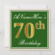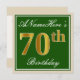 Este design de convite simples e bolsa mensageifesta de aniversario elegante apresenta uma mensagem personalizada como "Aniversário do 70 de ANameHere" (com o "70" a ter uma aparência falsa/de cor dourada) dentro de uma área quadrada de cor verde com um contorno simples de fronteira. O nome está em um texto elegante, de cor branca, semelhante a script, e pode ser personalizado. A parte traseira apresenta detalhes de convite personalizáveis. Um convite de aniversário como este poderia ser usado quando se convidava pessoas para uma festa de aniversário em prisão preventiva para alguém que comemora seu setuagésimo aniversário. [~Z0000225]