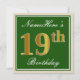 Este design de convite simples e bolsa mensageifesta de aniversario elegante apresenta uma mensagem personalizada como "NameHere's 19th Birthday" (com o "19º" a ter um aspecto de cor tipo "faux"/imitação dourado) numa área quadrada de cor verde com um contorno de fronteira simples. O nome está em um texto elegante, de cor branca, parecido com script, e pode ser personalizado. A parte traseira apresenta detalhes de convite personalizáveis. Um convite de aniversário como este poderia talvez ser usado ao convidar pessoas a uma festa de aniversário para alguém que comemora seu décimo nono aniversário. [~Z0000225]