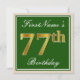 Este design de convite simples e bolsa mensageifesta de aniversario elegante apresenta uma mensagem personalizada como "77º Aniversário do Nome" (com o "77º" a ter um aspecto de cor falsa/imitação em forma de ouro) numa área quadrada de cor verde com um contorno de fronteira simples. O nome está em um texto elegante, de cor branca, parecido com script, e pode ser personalizado. A parte traseira apresenta detalhes de convite personalizáveis. Um convite de aniversário como este poderia talvez ser usado ao convidar pessoas a uma festa de aniversário para alguém que comemora seus setenta e sete anos de aniversário. [~Z0000225]