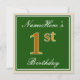 Este design de convite simples e bolsa mensageifesta de aniversario elegante apresenta uma mensagem personalizada, como "primeiro aniversario do NomeAqui" (com as "1ruas" com aparência falsa/imitação de cor dourada), dentro de uma área quadrada de cor verde, com um contorno de fronteira simples. O nome está em um texto elegante, de cor branca, parecido com script, e pode ser personalizado. A parte traseira apresenta detalhes de convite personalizáveis. Um convite de aniversário como este poderia talvez ser usado ao convidar pessoas para uma festa de aniversário em prisão preventiva para alguém que comemora seu primeiro aniversário. [~Z0000225]