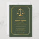 Uma camada legal de ouro de justiça e um tom de ouro de quadro redimensionado e um design de convite de festa de formatura verde que pode ser personalizado para graduações de direito ou outras de campo legal. Design composto por Holiday Hearts Design (direitos reservados).