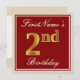 Este design de convite simples e bolsa mensageifesta de aniversario elegante apresenta uma mensagem personalizada, como "segundo aniversário do Primeiro Nome" (com o "segundo" com aparência falsa/de cor dourada), dentro de uma área quadrada de cor vermelha com um contorno de fronteira simples. O nome está em um texto elegante, de cor branca, semelhante a script, e pode ser personalizado. A parte traseira apresenta detalhes personalizados do convite. Um convite de aniversário como este poderia talvez ser usado ao convidar pessoas para uma festa de aniversário em prisão preventiva para alguém que comemora seu segundo aniversário. [~Z0000227]