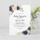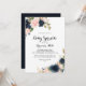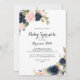 Este elegante convite para o bebê da caligrafia floral de inverno é perfeito para um chá de fraldas moderno. O design apresenta belas flores azuis escuras, azuis, marinhos, rosa, pinceladas, douradas e folhagem verde pintadas manualmente, amontoadas em buquês elegantes.
