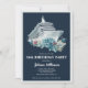 Elegante 50º convite para viagens de cruzeiro de festa de aniversário para mulheres. Personalize-o com o nome e os detalhes da parte, incluindo a data, linha de cruzeiro, porta de partida, informações RSVP, quaisquer outras informações necessárias. Design com um barco a aquarela e flores lindas sobre fundo azul marinho e detalhes prateados.