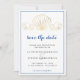 Este elegante design costeiro apresenta uma concha do mar estilosa em ouro e ondas com uma borda azul. Reverte para o padrão de concha de ouro em fundo azul. Perfeito para casamentos com tema de praia, verão ou náutico. Design©Rosalind Moore, Cherry Lane Designs.