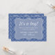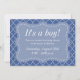 O Elegante chá de bebê convoca a mãe. | Convites personalizados. Texto do anúncio personalizado e cor do plano de fundo. design azul e branco com um lindo padrão quatrefoil.É um garoto!