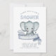 Simples Convite Simples Branco Azul Elefante Menino Branco Branco Bonito Este convite apresenta uma design de elefante e um padrão de bolinhas agudos de cinza.