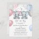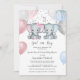 Este adorável convite revelador de chás de fraldas apresenta dois elefantes em azul e cinza e rosa e cinzas com balões e confete. A parte traseira apresenta a cor d'água da cinza macia. Facilmente personalizado para seu evento clicando em "Personalizar".