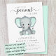 Um belo convite para o bebê neutro do ponto de vista do gênero, com "A Sweet Little Peanut Is On Your Way", escrito em tipografia moderna das cinzas suaves e um roteiro de na moda com pestanas, e uma aquarela verde de menta pastel de um elefante bebê. Personalize o nome da mãe e os detalhes da aspersão de bebê em uma simples tipografia de cinza. Pode também especificar o sexo do bebê, se desejado (por exemplo: "Está a Caminho").