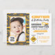 Fofo em construção convite de aniversário fotográfico. Cinza, esquema de cor amarelo e branco com caminhão de construção, sinal de precaução e padrão de cone de construção. Personalize o texto e a foto!