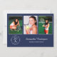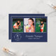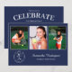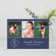 Personalize sua festa de formatura com convites personalizados. Substitua as 3 fotos de amostra pelas suas. Adicione o ano ao emblema branco sofisticado abaixo das fotografias na frente que diz "FORMADO NA TURMA DE [ANO]" com o nome do formando e a escola ao lado em fontes brancas elegantes e serifadas em um fundo azul-marinho. Substitua o texto de amostra branco no verso azul-marinho do convite para o seu evento. Personalize para qualquer formando: ensino médio, faculdade, pós-graduação, faculdade de direito, faculdade de medicina, escola técnica.