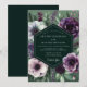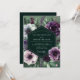 A dramatic and romantic design features a rich palette of deep emerald green, amethyst purple, and soft lavender. Lush, painterly arrangements of white anemones, deep purple blossoms, and delicate sprigs are artfully placed against the dark background. This elegant composition evokes a sophisticated and moody atmosphere, perfect for an enchanting evening affair.