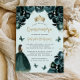Este adorável convite da quinceañera mostra uma fronteira de flores verdes esmeraldas de aquarela em um fundo verde pálido. Uma tiara dourada, uma menina de cabelo escuro num vestido esmeralda de princesa verde e pequenas borboletas verdes decoram o texto. A palavra "Quinceañera" e o nome do convidado de honra aparecem num elegante guião dourado, com o texto remanescente na fonte serif cinza.