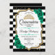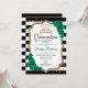 Convite de festas de Quinceanera. Na moda design em verde esmeralda e ouro brilhante falso. Apresenta faixas pretas e brancas, fontes de script, rosas, tiara e confetti. Perfeito para uma comemoração de 15 de aniversário do estilo clássico da princesa do glam. Impressos convites Zazzle ou modelo de impressão digital instantânea para download.