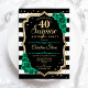 Convite de festas de aniversário de 40 anos surpresa. Design verde feminino preto, branco e esmeralda com ouro brilhante falso. Apresenta faixas pretas e brancas, rosas, fontes de script e confetti. Perfeito para uma elegante comemoração de aniversário feminina. Pode ser personalizado para mostrar qualquer idade. Impressos convites Zazzle ou modelo de impressão digital instantânea para download.