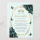Este adorável convite da quinceañera apresenta flores verdes esmeraldas de aquarela em dois cantos em um fundo verde pálido. Um quadro geométrico dourado envolve o texto, que é tocado por uma tiara dourada. A palavra "Quinceañera" e o nome do convidado de honra aparecem num elegante guião dourado, com o texto remanescente na fonte serif cinza. Pequenas borboletas verdes adicionam um toque decorativo.