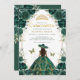 Mostre aos seus hóspedes o quanto se importam com este convite pessoal da Quinceanera. É uma mistura única de elementos modernos e tradicionais que certamente dará o tom para uma celebração memorável. Certifique-se de que todos os seus amigos e familiares venham com este convite elegante. A design apresenta uma rapariga bonito, bronzeada, a vestir um vestido carro brilhante e um chapéu de cor aquática adornada com rosas verdes e esmeraldas e verde macio, uma estrutura geométrica moderna e borboletas doces. Clique no botão "personalizar mais" se quiser reorganizar e formatar o estilo e a posição do texto.
