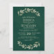 Estes convites para casamento são simples, rústicos e elegantes. Apresentam imagens de cor d'água pintada manualmente em tons de verde-claro em tons de luz em um fundo verde esmeralda emerald profundo. O texto combina caligrafia de script de rico com um layout tipográfico decorativo para criar um convite sofisticado, na moda e chic.