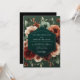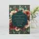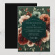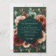 Experience a dramatic and romantic atmosphere with this elegant design. A lush bouquet of terracotta, blush, and crimson flowers bursts from a deep emerald green background. Painterly details on the delicate petals of roses and peonies create a moody, artful aesthetic for your special day's stationery.