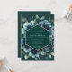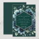 A dramatic mood is set against a deep emerald green backdrop. Lush, painterly anemones bloom in luminous shades of slate blue and teal, creating a sophisticated and romantic atmosphere. Softly rendered leaves complete this elegant botanical arrangement, perfect for an evening affair.