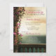 Este convite de aniversário da Quinceañera apresenta uma sacada encantadora. Há bonito rosas cor-de-rosa subindo uma coluna e um fio de luzes cor-de-rosa no topo. Esta varanda mágica parece um belo corpo de água e céu. Alguns gráficos por Origens Digital Curio em www.etsy.com/shop/OriginsDigitalCurio