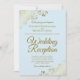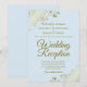 Este convite simples foi projetado para convidados que foram convidados para a recepção, mas não para a cerimônia de casamento em si. Apresenta um design elegante e sofisticado com letras em script dourado em um fundo azul-claro em pó e floreios e espirais dourados ornamentados em falso foil nos cantos. Uma maneira linda de convidar seus amigos e familiares para celebrar com você!