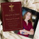 Este clássico e elegante design de convite para festa de formatura de apresenta um caduceus dourado, flanqueado pelas iniciais RN (para Enfermeira Registrada) sobre um fundo vermelho de burgundy. Personalize o texto com o nome do formando, a escola e o ano, junto com os detalhes do partido. Uma borda retangular de cor dourada enquadra o design. Adicione uma foto vertical do formando na parte traseira da placa.