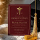 Este clássico e elegante design de convite à festa de formatura apresenta um caduceus dourado, flanqueado pelas iniciais editáveis RN (para Enfermeira Registrada) num fundo vermelho de burgundy. Personalize o texto com o nome do formando, a escola e o ano, junto com os detalhes do partido. Uma borda retangular de cor dourada enquadra o design. A parte de trás do cartão é uma arma sólida.