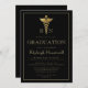 Este clássico e elegante design de convite de festa de formatura apresenta um caduceus dourado, flanqueado por duas letras editáveis (por exemplo, RN para a Enfermeira Registrada) sobre um fundo preto. Personalize o texto com o nome do formando, a escola e o ano, junto com os detalhes do partido. Uma borda retangular fina e dourada enquadra o design. A parte traseira da placa é preta e sólida.