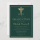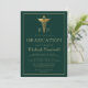 Este clássico e elegante design de convite para festa de formatura de apresenta um caduceus dourado, flanqueado por duas letras da sua escolha (por exemplo, RN para a Enfermeira Registrada) sobre um fundo verde escuro. Personalize o texto com o nome do formando, a escola e o ano, junto com os detalhes do partido. Uma borda retangular de cor dourada enquadra o design. A parte traseira da carta está verde estável.